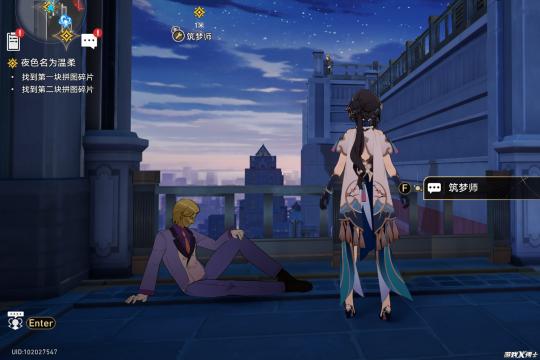 還有個靈感枯竭、失去了夢想的“築夢師”,築夢師就是匹諾康尼搭建設計夢境的人,那人背靠晨光頹廢不已,對面還有一對談情說愛的小情侶,兩相對比形成鮮明反差,需要用“鐘錶把戲”的玩法激活他的動力。