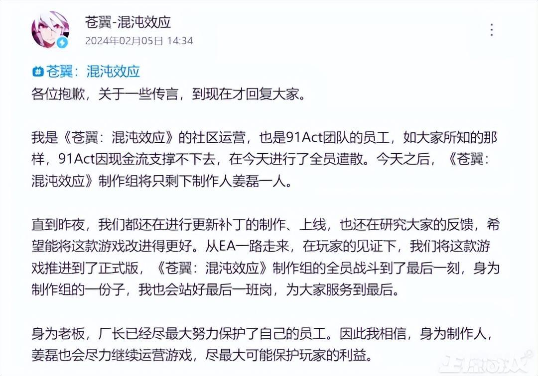 91Act的新作,買斷制的《蒼翼:混沌效應》於今年的1月31日上架,雖然遊戲steam口碑“特別好評”,好評率高達87%,但是國內相對小衆的遊戲類型,又沒有《完蛋!》或者《黑槍神:悟空》這樣的話題熱度,又遇上縫合怪物《幻獸帕魯》,因此遊戲銷量不如預期,加上DeNA不打款,最終導致公司貧窮到“倒閉”。