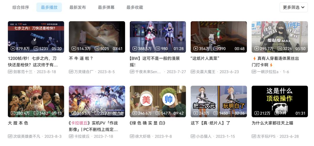而這樣的數據並非《卡拉彼丘》的巔峯,在其開測的5個月裏,B站上與其有關的視頻及播放量快速增長,截至目前播放量過10萬的視頻多至近千條,其中播放量最高的超過800萬——沒想到這款門檻不低的PVP射擊端遊,在玩家羣體這麼受歡迎。