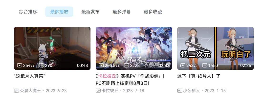 在二次元濃度較高的B站上,播放量最高的遊戲相關視頻便是對紙片人概念和玩法的展示,網友們直呼《卡拉彼丘》將「二次元玩明白了」。