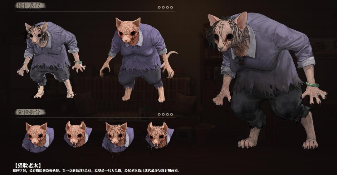 比如遊戲怪物貓臉老太的設定原型,來源於上個世紀末流傳甚廣的靈異事件,其怪物形象也跟故事的描述一致,貓臉、人身、力大無窮……爲了凸顯怪物的恐怖氣質,製作組還特意選擇了無毛貓作爲設計原型,並基於此迭代了數個版本。