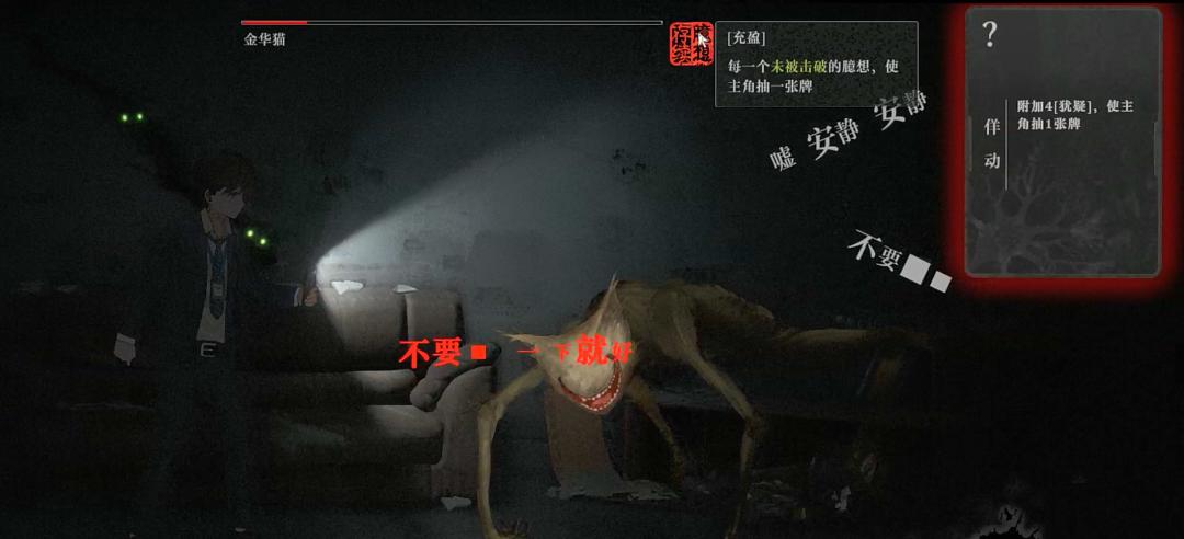 怪物金華貓的設計更巧妙,其技能套組跟背景故事契合:背景故事中,金華貓是一種先迷惑人,再吸走其精氣的怪物;而遊戲中的金華貓則會通過「佯動」給玩家送手牌,當我們以爲它「人還怪好嘞」時,一記「猛襲」(玩家手牌過多時會承受巨量傷害)立馬教大家做人。