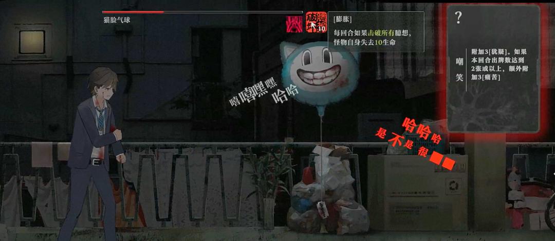 但實際上臆想破壞的設計相當複雜。前面提到它展示的文字不僅符合怪物的人設、機制,還會通過技能或狀態對當前的戰鬥產生影響;最後怪物被擊敗時出現的黑色文字,還需要玩家利用理性或者感性的卡牌進行消除。