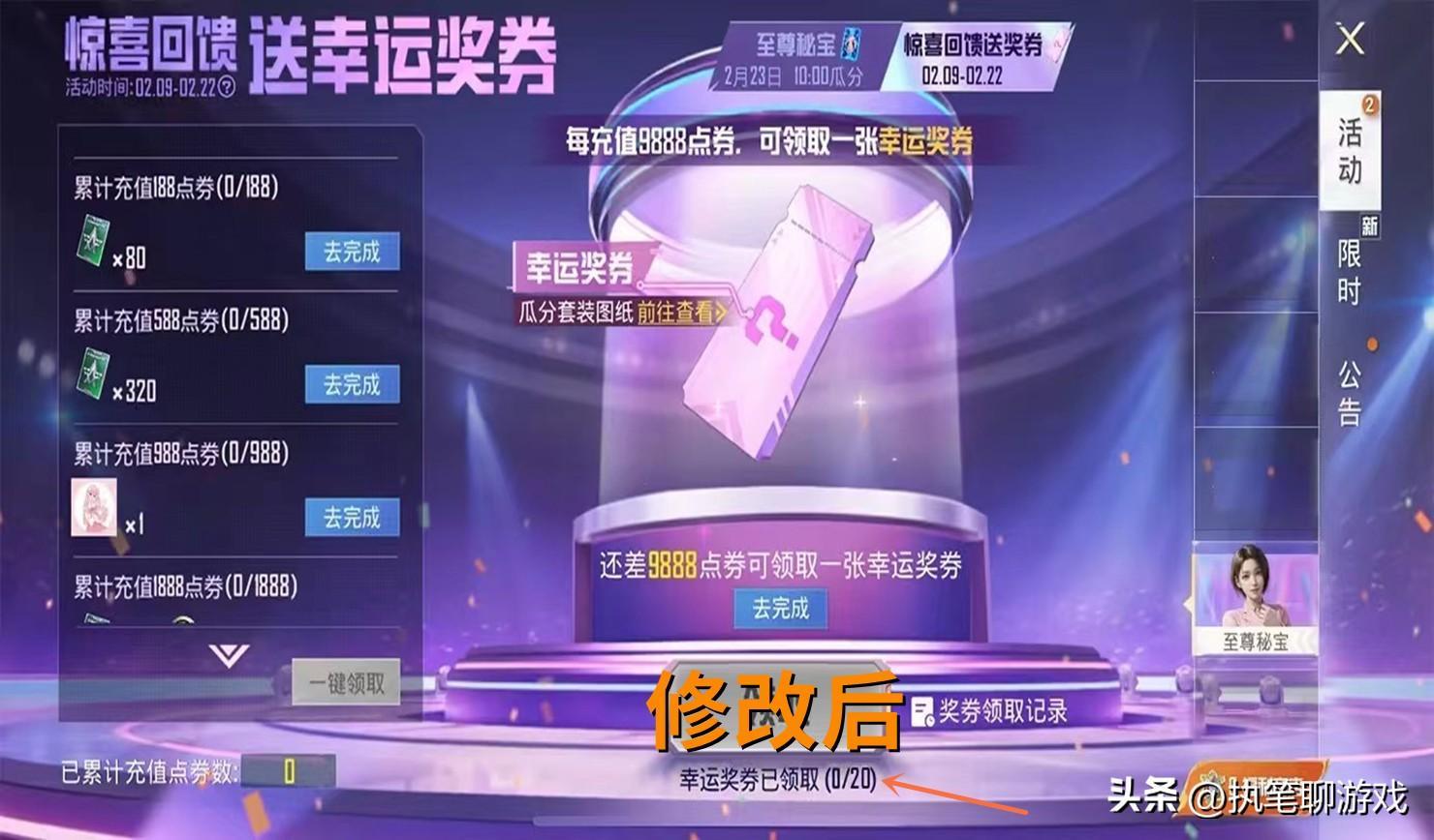 接下來我們把時間回到現在,再次打開和平營地的公告,就會發現光子已經第2次修改,變成了“幸運獎券已領取(0/20)”。
