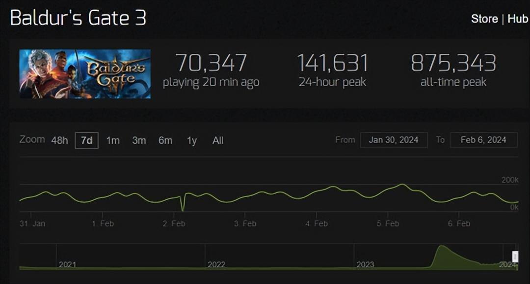 另一個比較有趣的數據是,早在2023年8月31日發售的《博德之門3》正式版,目前的在線遊玩人數依舊堅挺:其遊玩人數峯值在14.1萬,平均人數處於7.5萬左右。