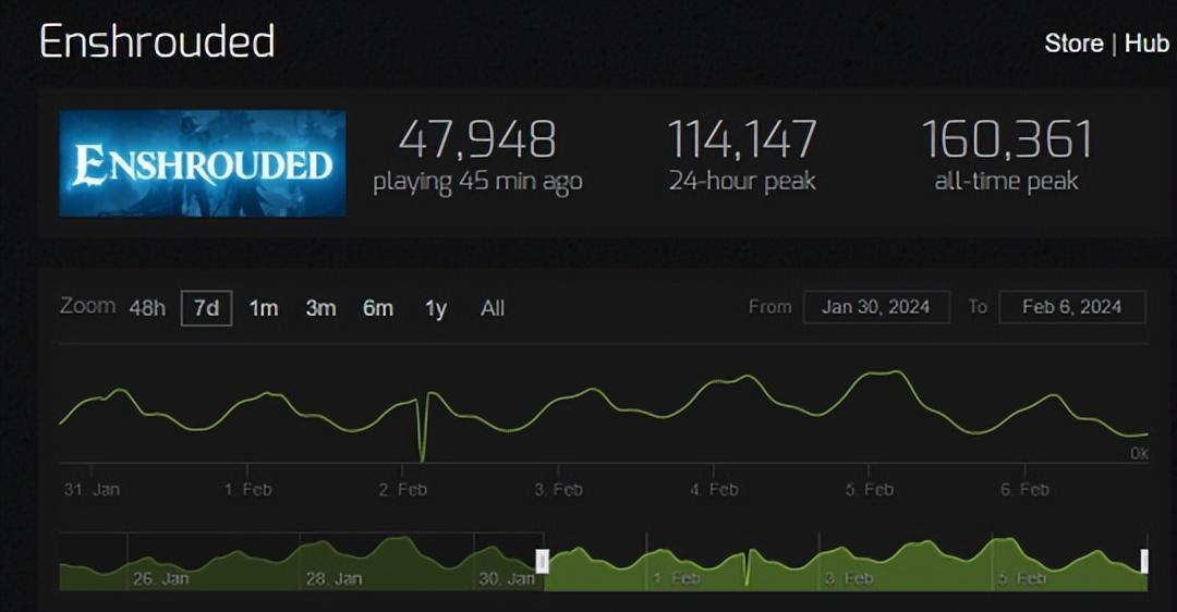 順帶一提,跟《幻獸帕魯》同時期發售的生存建造類遊戲《霧鎖王國》,當前的在線人數峯值已跌至11.4萬,平均在線人數也不足5萬人。