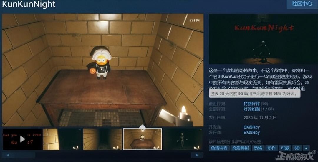 目前遊戲在B站上單個視頻最高播放量高達296萬,全站排名44,在steam上口碑“好評如潮”,好評率高達98%,好評基本上都在玩坤坤的梗。