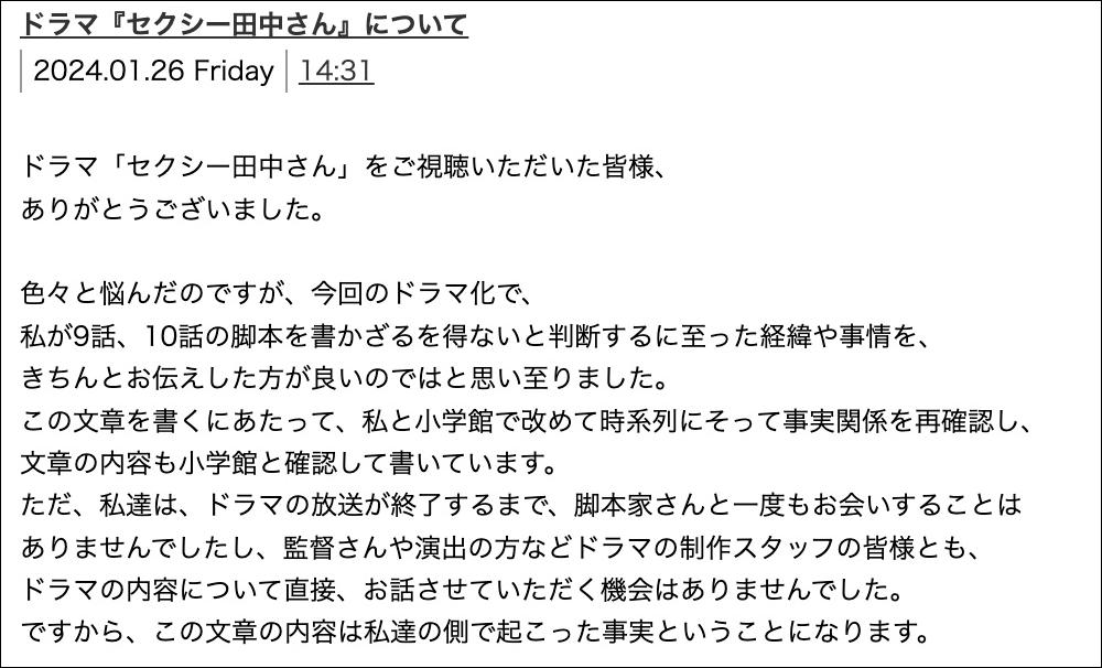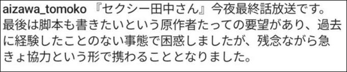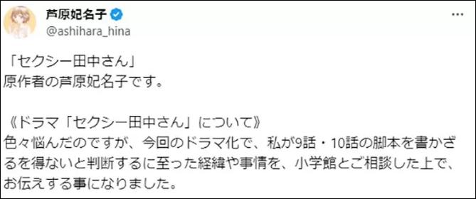 我收到了很多關於《Sexy田中小姐》最終回的評論和DM。先要重複一點,我寫的劇本是1~8集,最終寫9~10集的劇本是原作者,請不要誤會。很抱歉不能回覆每個人,這次的事情讓我深刻地思考了影視劇的本質,以及編劇的存在意義。我會把這痛苦的經驗活用到下次,讓自己說今後也要努力,不要重蹈覆轍。
