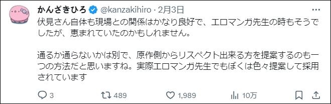 在推文中,他回憶在動畫製作期間,他作爲原作者一直無法和動畫製作組建聯,而直到動畫播出後,作者才獲得了第一次和製作公司當面表達自己意見的機會。