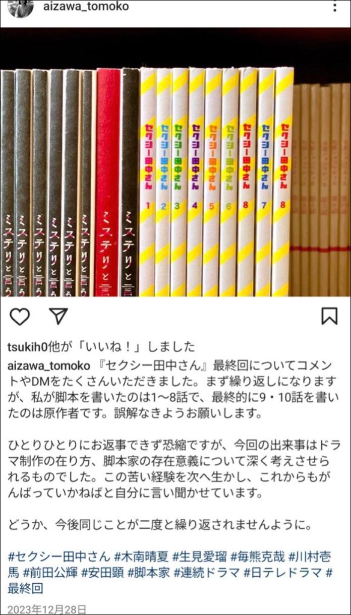 這篇推文迅速在社交媒體上發酵,編劇的同行也在相澤友子的評論下附和非議《Sexy田中小姐》的結尾,本來漸歇的輿論也再一次因爲涉事推文的出現而沸騰。