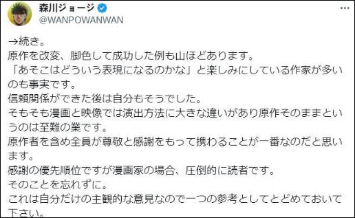 原作改變、改編成功的例子數不勝數。事實上,相當多的作家自己也很期待作品中的場景,會用什麼樣的方式來表現。在和動畫組建立好信賴關係之後,我自己也是這樣的。說到底,漫畫和影像的演出方式差別很大,想要完全堅持原作是極其困難的。我認爲包括原作者在內,在參與制作的時候,最重要的是心懷尊敬和感謝之情。