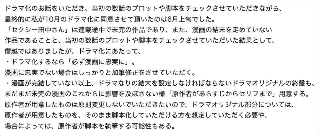 《Sexy田中小姐》的原作漫畫仍在連載,但電視劇需要結局,所以爲了不影響漫畫,作爲原作者她會提供從大綱到臺詞的所有內容,並希望不要對提供內容進行修改,希望編劇能以此爲藍本編寫劇本,必要情況下她作爲原作者可以直接執筆。