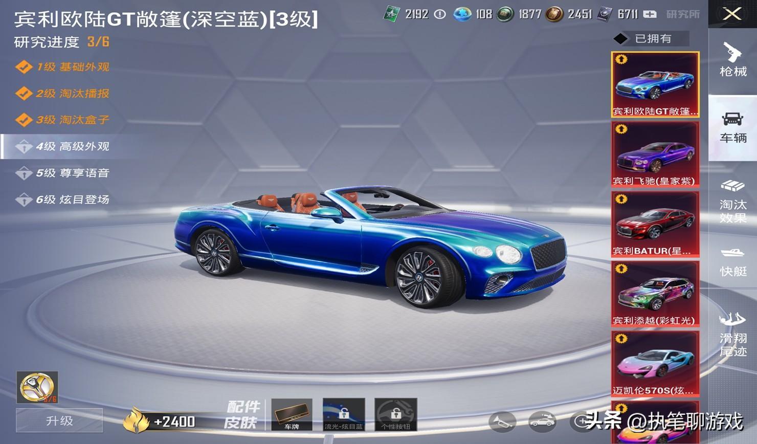 而在賓利系列上架之前,《和平精英》所有的升級車只需要3個升級徽章即可到高階外觀。