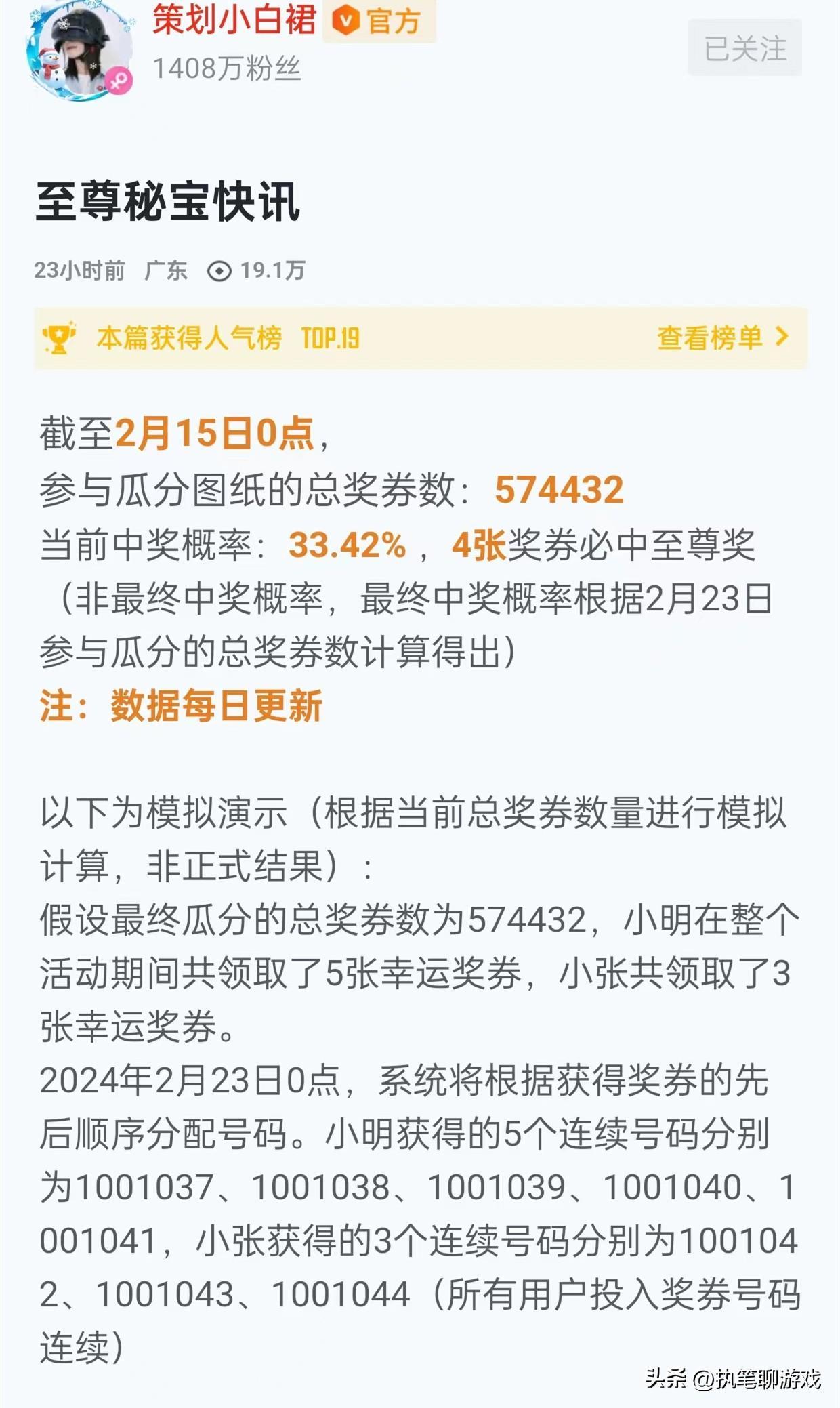 如圖所示,在光子最新官宣的快訊裏,我們可以看到:目前的總獎券數量將近58萬,概率爲33.42%,並且提醒大家:4張獎券必中至尊獎,也就是101的圖紙。