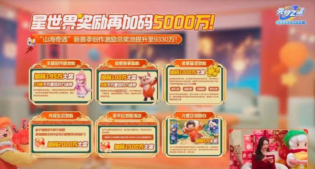 從2月3日開始,《元夢之星》登錄就能領紅包封面;到了年三十,遊戲到了晚上8到9點一個勁地下福袋雨,據說要下到正月初九才消停;一堆新春活動也在狂送“星運紅包”,裏頭有現金、有合作品牌的優惠券。