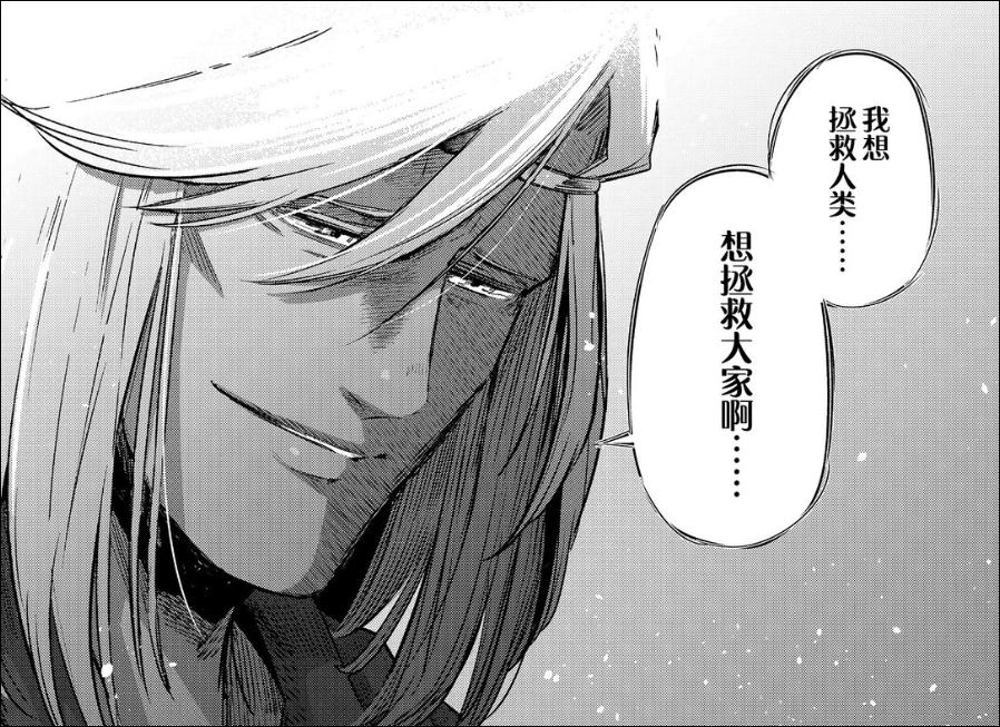她跑到了赫魯庫的面前,思索自己的發言,最後喊出和赫魯庫完全不一樣的話:“拯救,人類吧。”