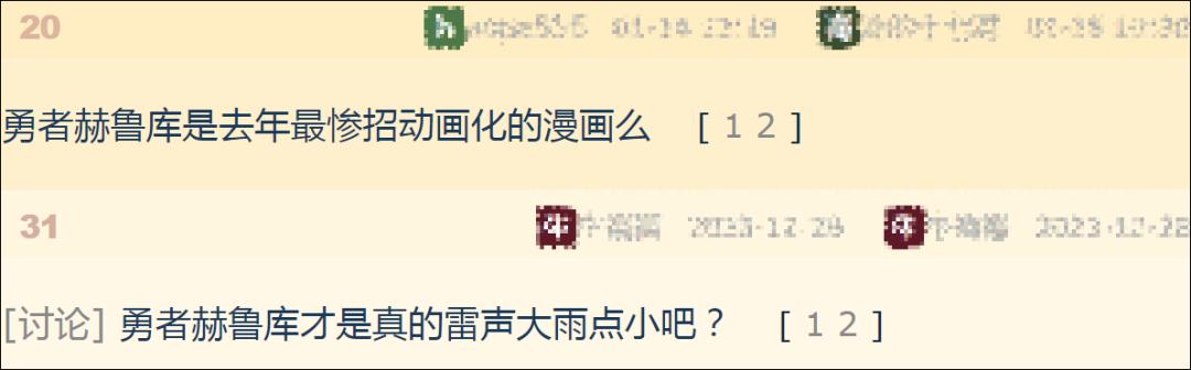 但有意思的是,在動畫正式完結之後,《勇者赫魯庫》的討論反倒多了出來,在貼吧論壇,它因爲其他作品“慘遭動畫化”的經歷而被反覆談起,被不少人戲稱爲“慘遭動畫化”的經典。