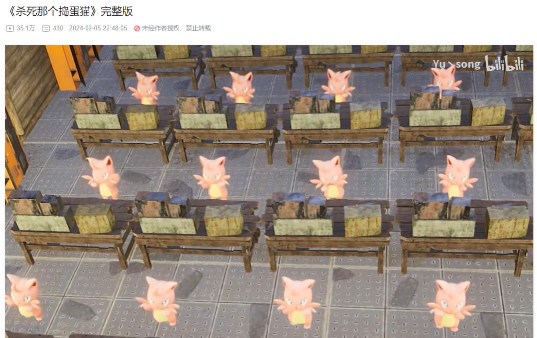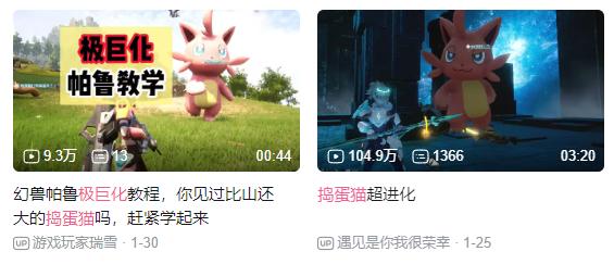 1月末,玩家社區發現了一個讓帕魯變巨大的BUG。此時搗蛋貓又成了最好的“實驗品”——讓搗蛋貓“極巨化”,配上數碼寶貝的進化BGM,挑戰強大數倍的敵人,造就了多個幾十萬播放的視頻。無意間,搗蛋貓又被賦予了一種小人物逆襲的精神。