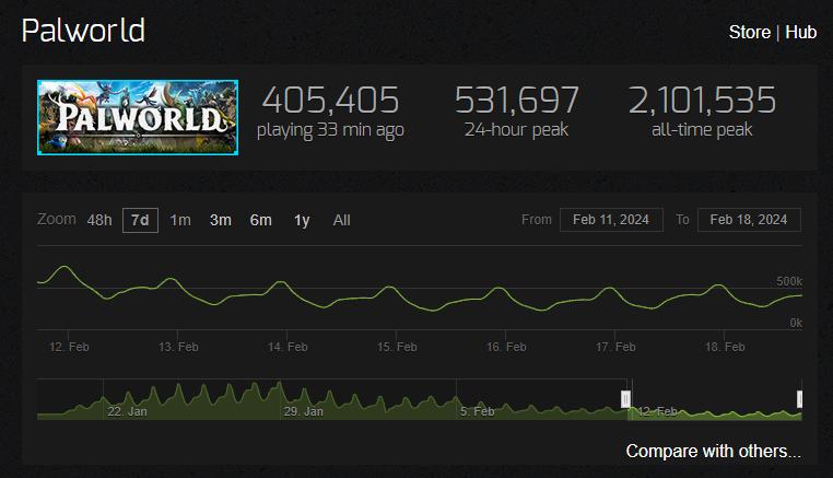 經過一個春節假期,《幻獸帕魯》證明了自己年度爆款的含金量。雖然同時在線人數有所下滑,被一些圈外媒體報道成“暴跌75%”,但實際上,《幻獸帕魯》每天還有50萬的在線峯值,在整個Steam也能排到前三。