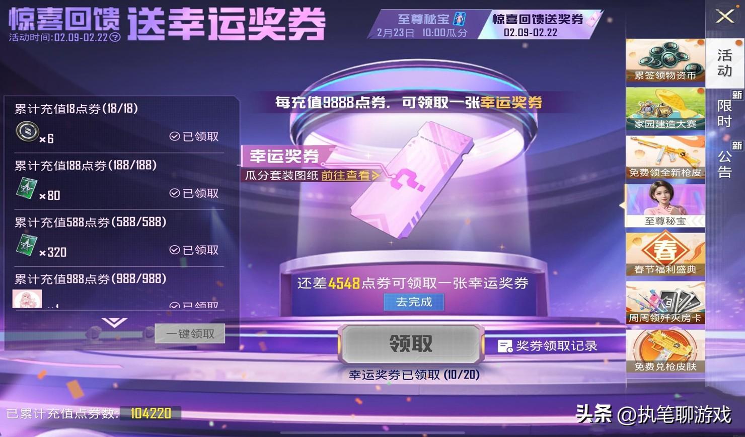 但是,對於大多數老玩家來說,20張拉滿並不值得,所以目前被公認的方式就是:怒砸16個648,拿下10張幸運券,只爲等當天開啓至尊祕寶的時候,進可攻、退可守。