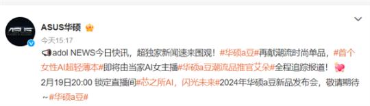 華碩官方宣佈a豆14/Pro 2024筆記本將於2月19日20:00正式發佈,官方宣稱爲“首個女性AI超輕薄本”。