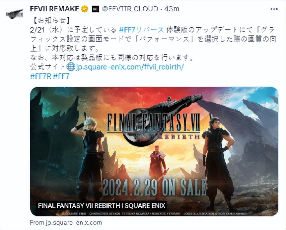 《最終幻想7:重生》官推宣佈,試玩版將於2月21日的更新中改善提升“性能模式”畫質,此更新也適用於正式版。