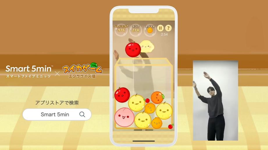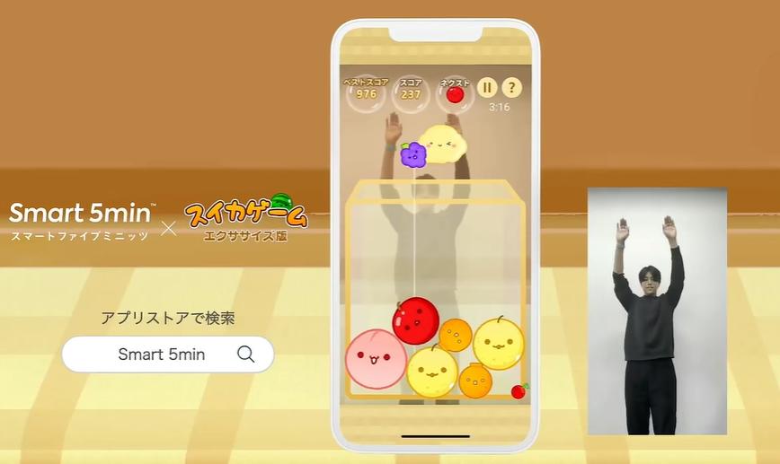 此前在日本爆火的益智遊戲《西瓜遊戲(合成大西瓜)》推出了最新體感運動版本,玩家可以在「Smart 5min」App中免費遊玩,通過攝像頭和遊戲中的道具互動。