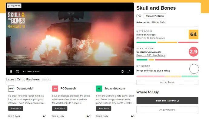 育碧新作《碧海黑帆》已於2月16日發佈,登陸Ubisoft Store、Epic Games Store、PS5和Xbox Series X|S平臺,然而遊戲發售後,M站上玩家評分僅有2.9分,成爲今年目前玩家評分最低的遊戲。