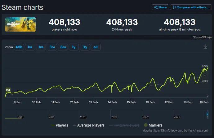 根據 SteamDB數據顯示,PlayStation新作《絕地潛兵2(HELLDIVERS2)》的同時在線人數峯值已經突破了40萬 ,超過了《給他愛5》的364,548人。