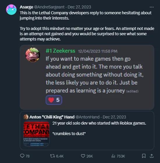 首先,對一名遊戲開發者來說,熱愛自己的事業和堅持都非常重要。正如前文所述,從Roblox、Itch.io到Steam,Zeekers已經整整做了十年遊戲,《致命公司》是他的第20部作品。Zeekerss曾經在Discord的一篇帖子中寫道:“如果你想製作遊戲,那就動手去做吧……不要紙上談兵。學習是個過程,你需要爲此做好準備。”