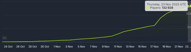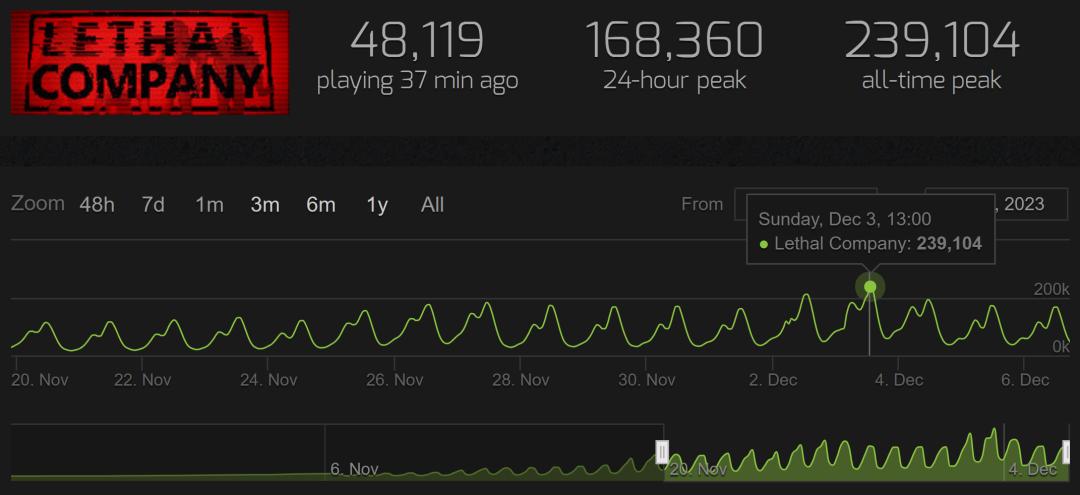 10月23日,《致命公司》的EA版本如期發佈,隨後迅速走紅。遊戲上架首日Steam最高同時在線玩家數約爲611,從那以後每天都在穩步增長,大約三週後已經飆升至43268……到11月底,《致命公司》已經成爲世界上最熱門的PC遊戲之一。更重要的是,雖然《致命公司》吸引了一些主播關注,但其增長在很大程度上依賴於口碑傳播。