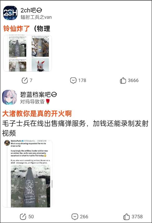 所以“二次元炮彈”的本質其實就是一場普普通通的生意,它和二次元並沒有什麼強關聯,就和一年前的“烏克蘭炮彈寫字”一樣,看着烏克蘭人做着直播把“我是神裏綾華的狗”塞進炮筒,然後發射出去,這件事情的所有娛樂其實都僅僅停留在字面本身。