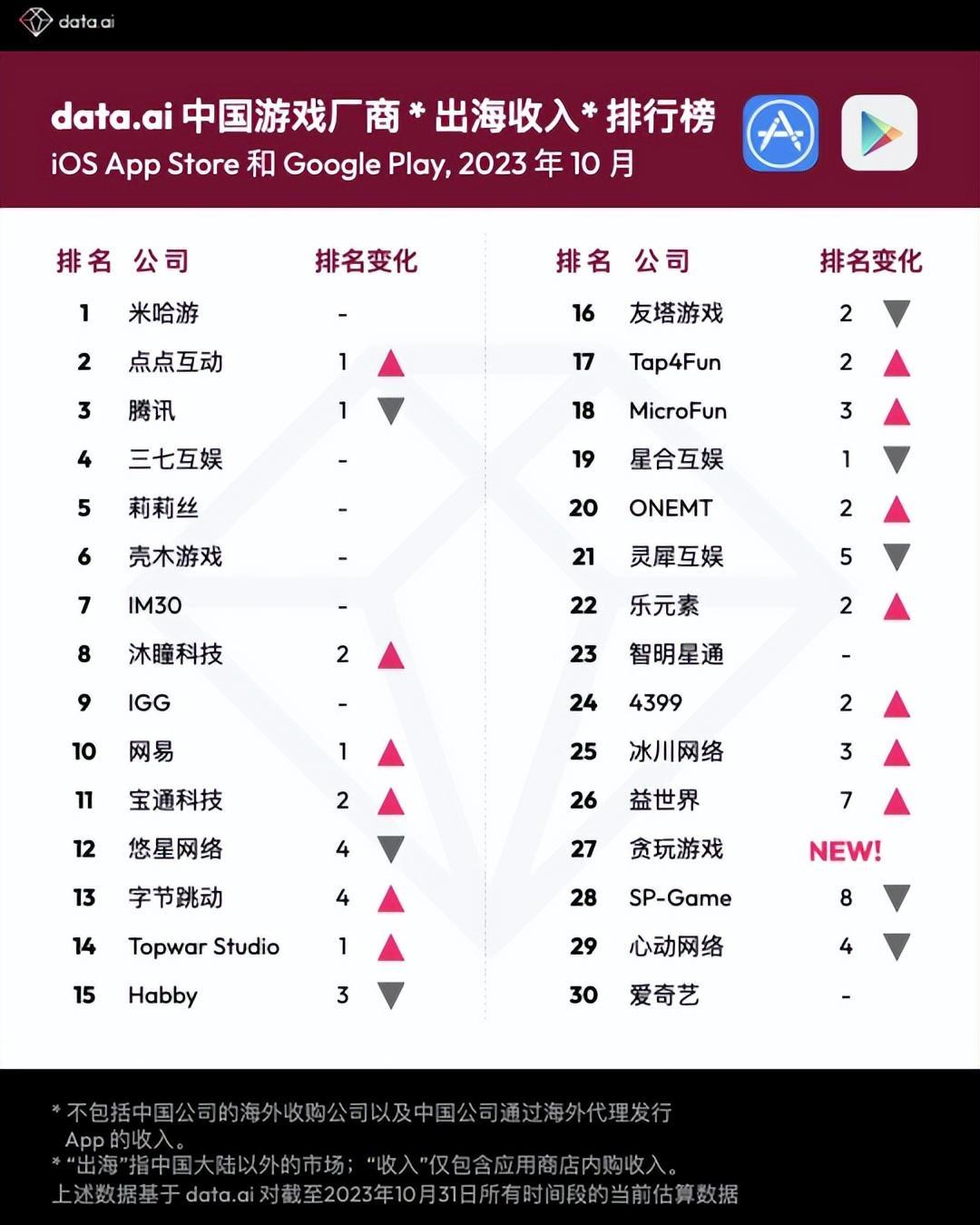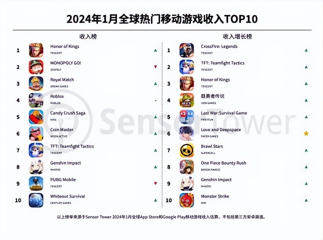 收入榜:前10名分別是《王者榮耀》、《MONOPOLY GO!》、《皇室戰爭》、《Roblox》、《金幣大師》、《金剷剷之戰》、《原神》、《PUBGM》、《寒霜啓示錄》