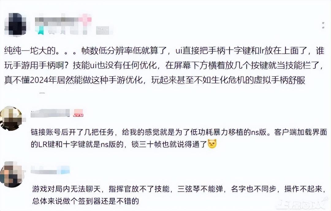 還有網友懷疑這遊戲就是爲了控制功耗暴力移植的NS版,所以鎖30幀,還有LR鍵和十字鍵。更有網友嘲諷,手遊版做個簽到器還是很不錯的,因爲遊戲局內無法聊天,指揮官放不了技能,名字也不同步,總之就是操作非常不方便。