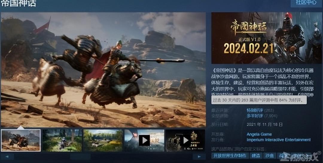 由安琪拉遊戲開發,帝國影遊發行的冷兵器戰爭沙盒遊戲《帝國神話》在steam上開賣,正式版V1.0遊戲本體售價138元,首周享9折優惠,遊戲支持官方服務器,自建服務器以及局域網遊戲,遊戲擁有主機模式和單機模式,並開放MOD編輯器功能。