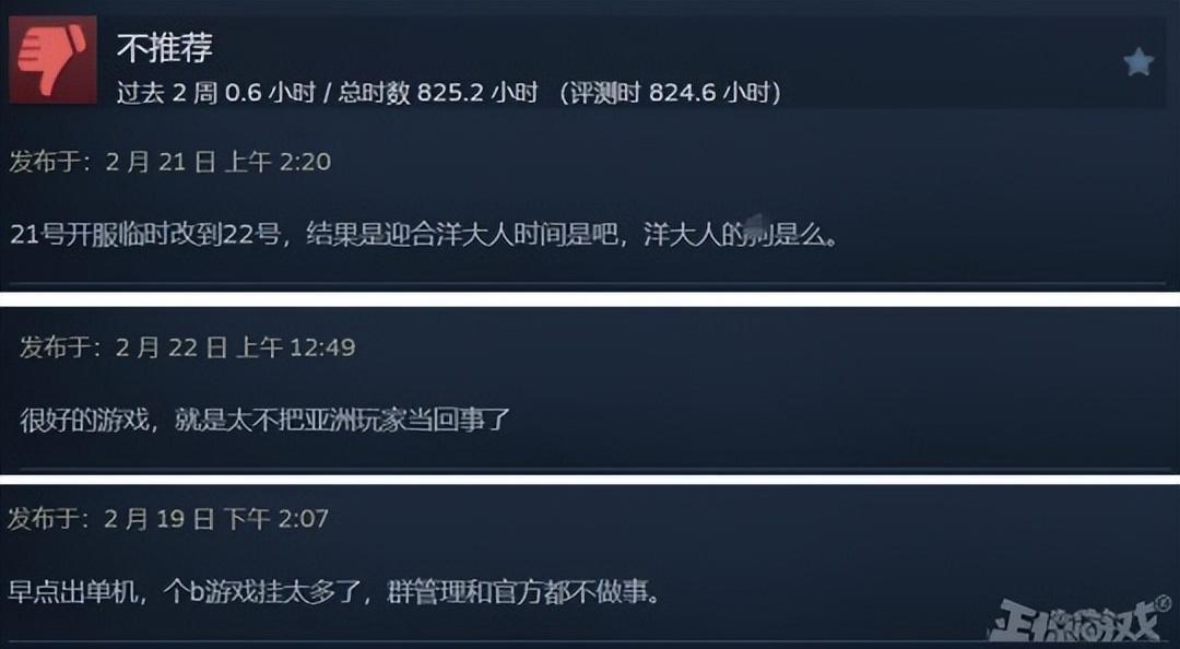 有差評玩家吐槽,說遊戲爲了配合洋人的時間,21日開服改到22日。有玩家就直言,遊戲是好遊戲,就是不太把亞洲玩家當回事。有玩家希望早點出單機,因爲現在遊戲開掛的太多了,而官方卻沒有進行處理。