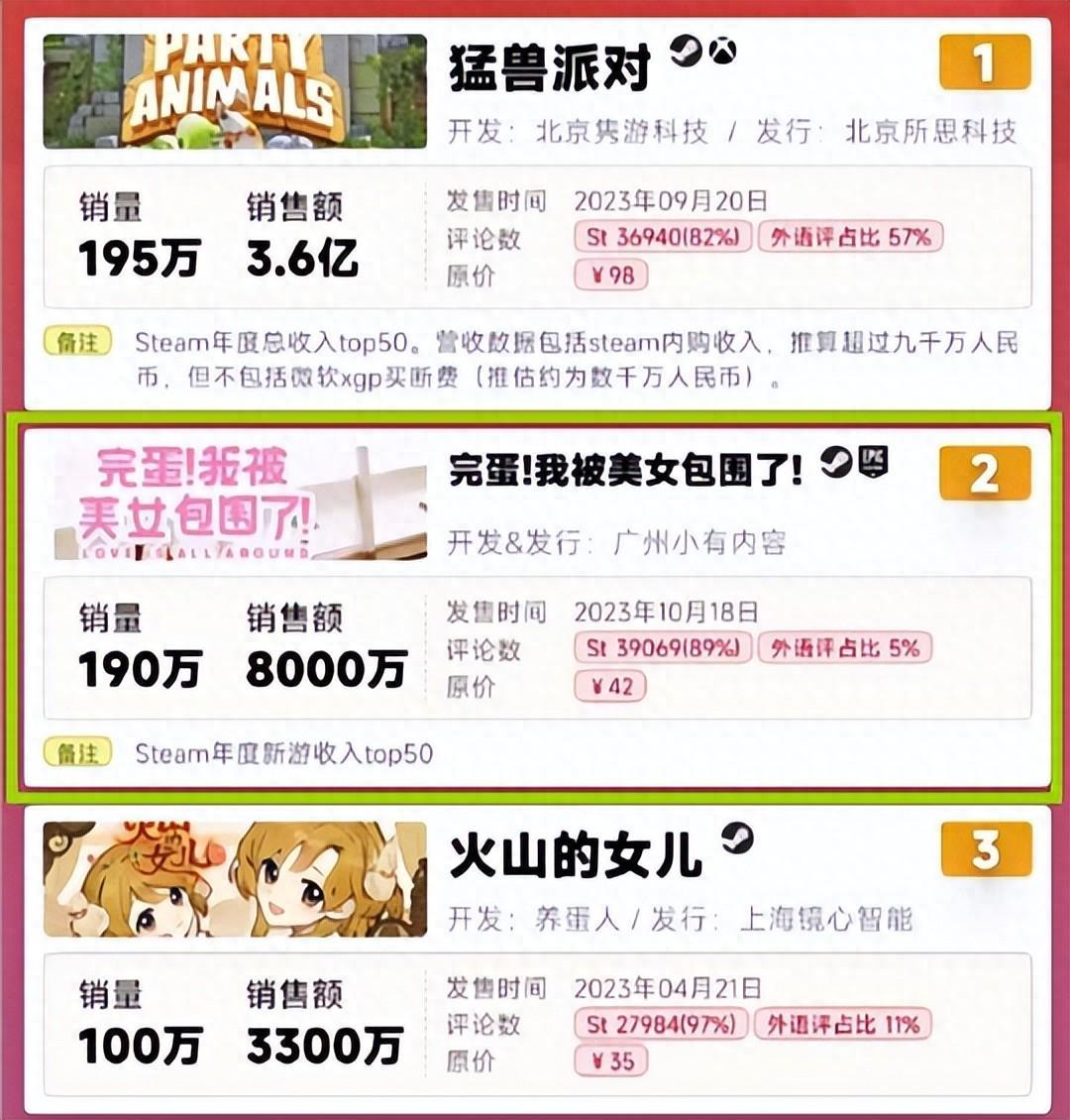 前陣子,國遊銷量吧公佈了2023年的數據,《美女》僅用不到3個月就狂賣了190萬套,以8000萬的銷售額登上了亞軍寶座。