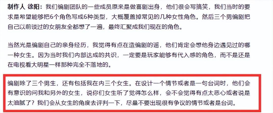 這也是爲什麼,《美女》項目的內容總監本身是女性,還有三個女編劇來給劇情和臺詞的節操兜底。深V雖好,但真正能打動人心的,還得是那種美好的、不被扭曲的戀愛體驗。咱們男玩家的情緒價值,還是需要有人來滿足,誰都有做夢的權力。