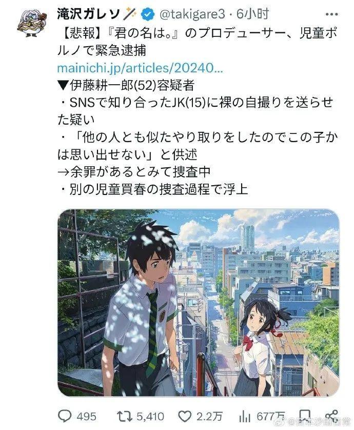 昨天,日本媒體曝出一則新聞,《你的名字》《鈴芽之旅》等動畫的製片人,因要求女高中生髮送淫褻圖片,涉嫌違反了兒童買春、兒童色情禁止法,被和歌山縣警方逮捕。 不過別擔心,這位製片人的名字叫伊藤耕一郎,現年52歲,和電影導演新海誠不是一回事。在遊戲和電影工業體系中,製作人/製片人和總監/導演的確是最大的兩個職位,但分工非常明確。導演負責藝術創作,製片人則主要負責項目管理,人員、投資、開發進度都由製片人說了算。某種程度上,製片人的權力和地位甚至要超過導演。伊藤耕一郎是新海誠從2004年的第二部作品《雲之彼端,約定的地方》開始,就與他長期合作的製片人,參與了新海誠的《秒速5釐米》《追逐繁星的孩子》《言葉之庭》《你的名字》《鈴芽之旅》等幾乎所有作品,讓人想到喬丹和皮蓬、路飛和索隆的二人組,可以說是新海誠最重要的合作搭檔之一。對於此次逮捕行動,日本警方表示,伊藤耕一郎從2021年9月開始,透過SNS認識了當時年僅15歲的女高中生。在清楚對方是未成年人的情況下,卻以支付12,500日元(約人民幣600元)爲條件,要求對方給自己發送全裸自拍照和影片等。警方在伊藤耕一郎的手機、電腦中,還發現其他女子的私密照,受害者遠不止一位。伊藤耕一郎在被捕後也坦承罪行,表示還和其他女性有類似互動。不過對於這名當時只有15歲的少女,他居然已經不記得了。慣犯了屬於是。長期以來,伊藤耕一郎都鮮少在公衆場合露面,網上關於他的資料少之又少。不過,在新海誠所屬的動畫工作室CoMix Wave Films的官網上,刊登了一篇2011年時候的伊藤耕一郎的採訪。當時他正與新海誠一起製作《追逐繁星的孩子》。從採訪中我們可以得知,伊藤耕一郎其實是半路出家的動畫人。他大學時主修應用化學,畢業後在一家制造業公司上班。但從他後續的經歷來看,此人並非是人們固有印象中的“木訥理工男”,做派非常“自由灑脫”。在製造公司工作4年半後,伊藤耕一郎認爲自己存了一些錢,該做自己喜歡的事了,於是毅然辭去工作,跑去英國住了六個月,又去美國住了一年,期間考上了語言學校。但與其說是留學,不如說是旅行,大部分時間都在外面玩,後來回到日本也是因爲積蓄用完了。回到日本從事電影行業,也純粹是興趣使然。在加入CW Films之前,他並沒有看過新海誠的作品,也不清楚自己應聘的是什麼樣的工作,但是他和新海誠這樣有才華的人一拍即合。起初按照新海誠的設想,《雲之彼端,約定的地方》只是一部60分鐘的中篇動畫,但是伊藤耕一郎在看完劇本後,認爲《雲之彼端,約定的地方》無論如何都應該做成90分鐘的長篇,並重新組織了一切,推進項目順利進行。《雲之彼端,約定的地方》也是新海誠的第一部長篇動畫,和登陸電影院的作品,同年在日本第59屆每日電影獎頒獎典禮上,擊敗了宮崎駿的《哈爾的移動城堡》,榮獲最佳動畫電影獎。因此可以說,伊藤耕一郎是新海誠職業生涯中起到至關重要的貴人之一。只可惜他過分自由的性格成了一柄雙刃劍,把自己送進了牢內。不知道新海誠的下一部作品會不會因此受到影響。