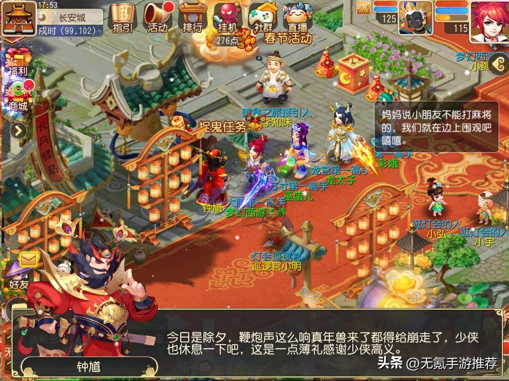 再去找另外的任務NPC也收穫一樣的答案,鍾馗勸我“少俠休息一下吧”。原來不用做日常任務是這個意思,是沒得做直接領獎勵是吧。新年第一天給玩家放大假的遊戲,真讓我大開眼界。莫非《夢幻西遊》手遊的策劃真是天才?這不完美利用大家的逆反心理嗎,你勸我休息,我當然是抓好友上線,把春節活動玩個遍先。