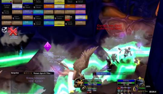 從HC Elite放出來的視頻來看,Tinyviolin用小號在MT開怪的一瞬間,跑去將克蘇恩的眼棱連線連到大團上,秒殺了數十名脆皮後排法師。好在指揮第一時間發現了這個貨,在語音頻道大喊喫化石合劑+回城,最後保住了團內剩下成員的小命。