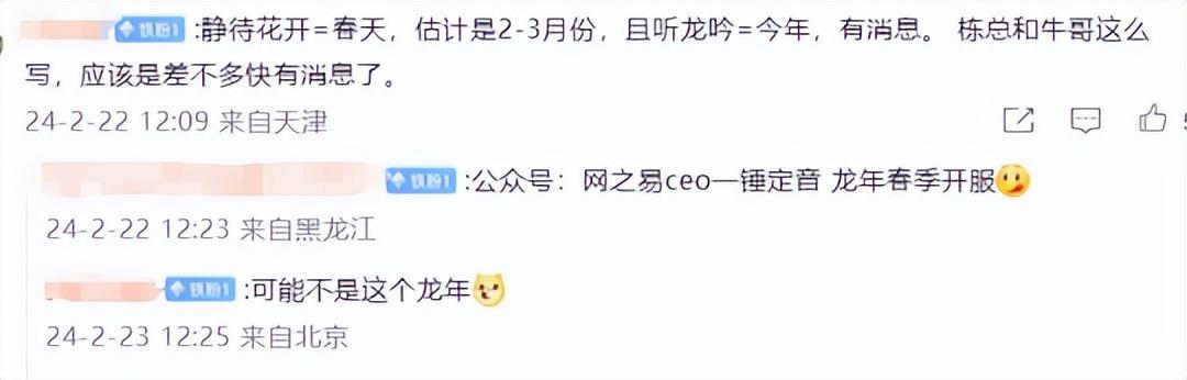 經過有心網友的解讀:“靜待花開=春天,估計是2-3月份,且聽龍吟=今年,有消息。 棟總和牛哥這麼寫,應該是差不多快有消息了”。