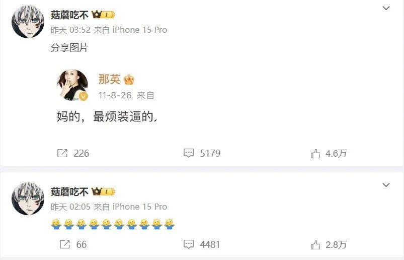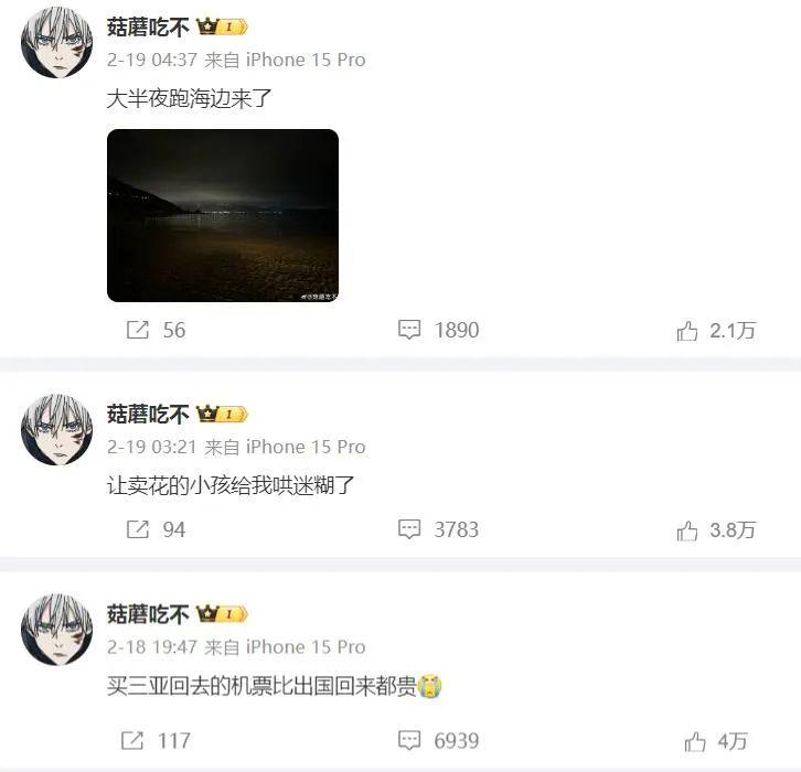 更離譜的是陳澤的微博“菇蘑喫不”。他都沒有用本名、網名取ID,每天就是發一些簡短的吐槽、生活片段,但每條都能引來數千評論和上萬的點贊,堪比流量明星。