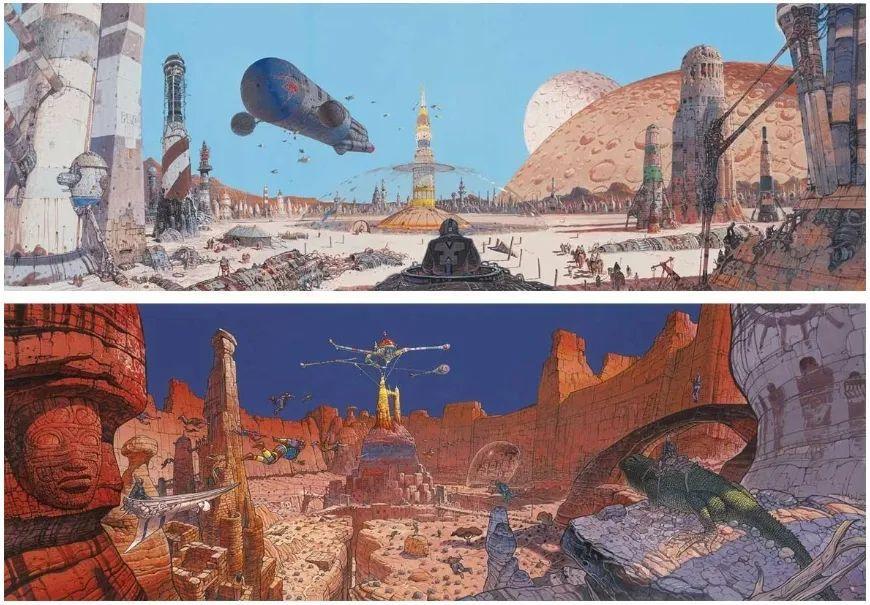 比如我最喜歡的第二章,很有法國漫畫大師莫比斯在某個時期的神韻。從色調、環境(紅色荒原、彩色植物與流線型白色建築),到那種空曠天地與散落的文明居所的結合,都隱約讓人想到中期的莫比斯。