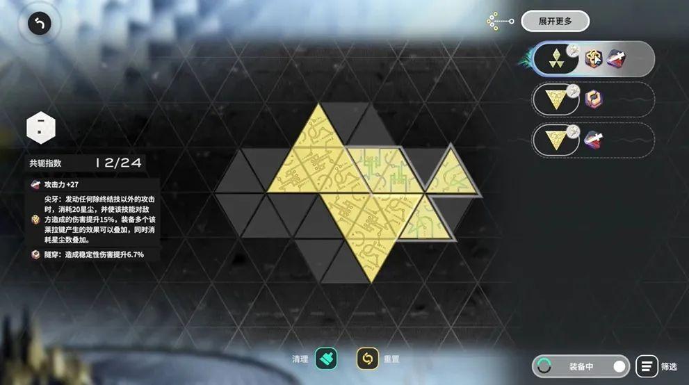 比如這遊戲裏,角色也有裝備系統,放在持續性服務的遊戲裏,一般會設計成耗費玩家的體力/資金來獲取優良裝備;但在買斷制中,這套邏輯行不通了,得有別的方式。要讓角色變強,除了點亮技能樹,你還需要研究一種叫“共軛”的裝備機制,顧名思義,它是考驗物件搭配能力的小遊戲:玩家靠探索或製造獲得萊拉鍵後,通過類似“拼七巧板”的方式裝備上身,獲得屬性增益——要讓角色通過這系統變得更強,你得想辦法把七巧板拼得更好。