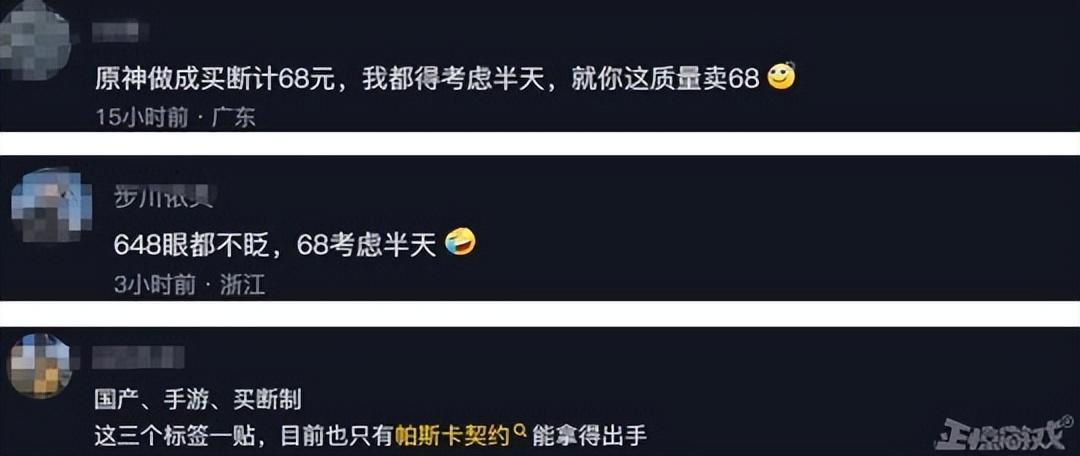 吐槽的也不少,有網友就表示《原神》要是賣68都要考慮半天,這質量也敢賣68?也有網友吐槽那些嫌棄貴的,648眼都不眨,68考慮半天。還有的網友則表示,“國產”“手遊”“買斷”這三個標籤一貼,目前也只有《帕斯卡契約》能拿得出手。
