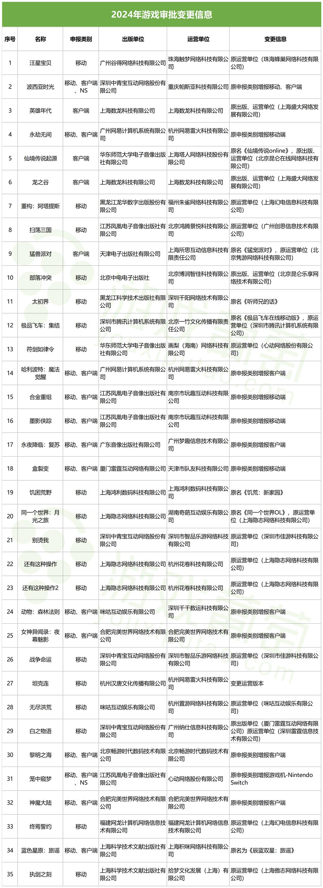本批過審遊戲完整名單及變更信息如下(點擊查看高清圖):