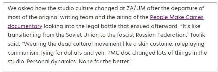 讓人有些難評的是,被裁員後,他一改當初的口徑,在採訪中猛烈攻擊ZA/UM現有的高層。稱他們纔是真正有毒、易怒,對合作者進行語言侮辱的一方,且他們毀掉了遊戲中的無數角色,毀掉了遊戲外的無數創作者,其中就包括庫維茲。