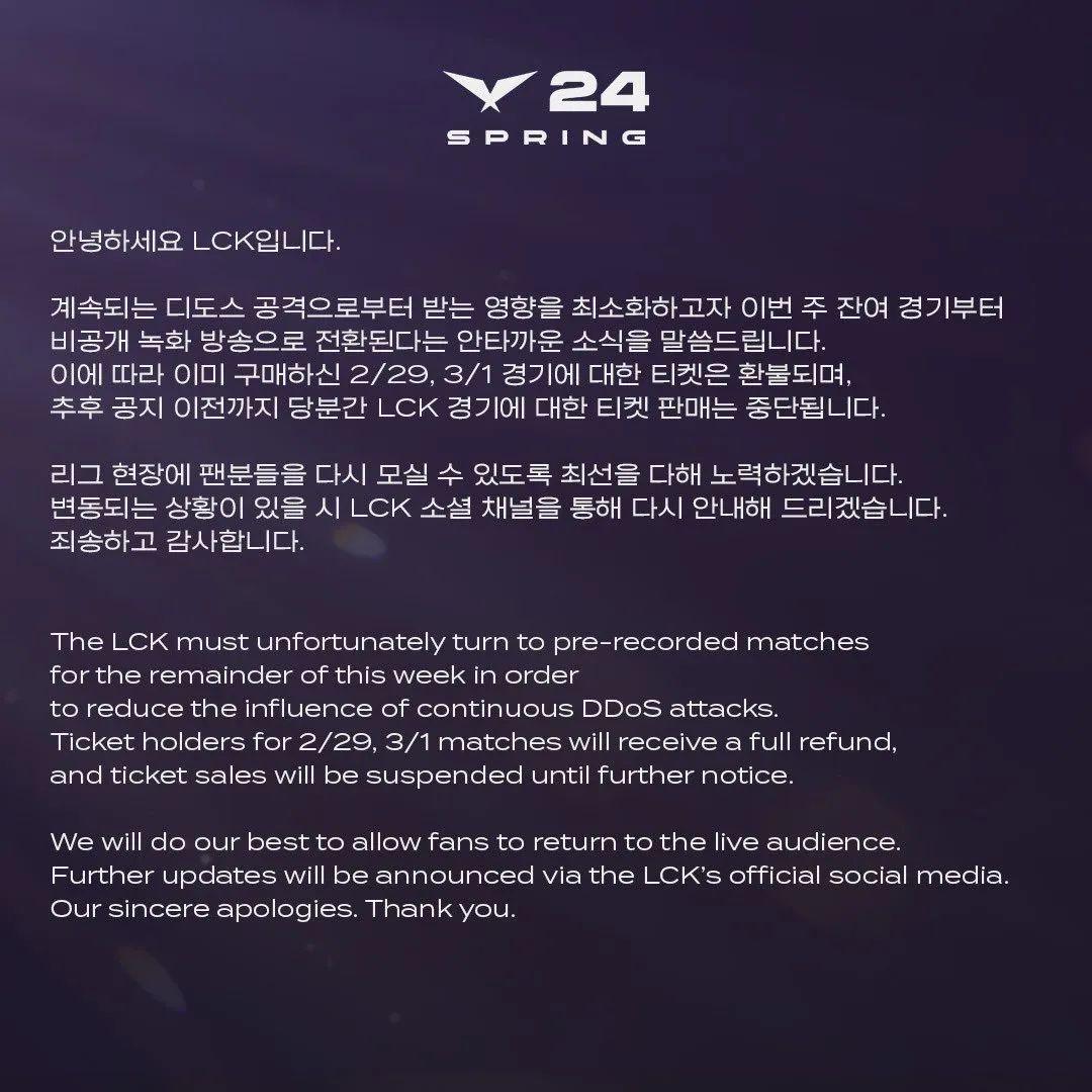 LCK近日遭受了持續不斷的DDoS攻擊,爲了最大限度地降低影響。決定將本週剩下的比賽由直播的形式轉變爲錄製播出。此前已購買的2月29日及3月1日的門票將被退還,同時門票也會停止銷售。若有變動,將發佈公告告知。