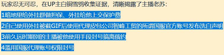 在玩家的描述裏,該主播以國服代理“壹佳”爲靠山,多次用腳本開掛被封后,讓“壹佳”爲其向遊戲官方擔保解封,然後繼續開掛,甚至還讓官方修改遊戲內數據,讓其賬號擁有超高大魚爆率。